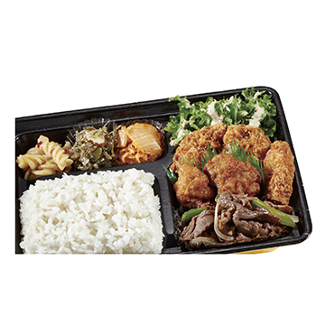 국내산 돼지고기의 등심 부분만을 두껍게 썰어 만든 돈까스, 부드러운 순닭다리살을 한솥이 개발한 튀김옷으로 바삭하게 튀긴 치킨가라아게, 부드러운 호주산 소목심에 한솥이 개발한 특제 불고기소스로 버무려 만든 소불고기로 구성된 도시락 입니다.