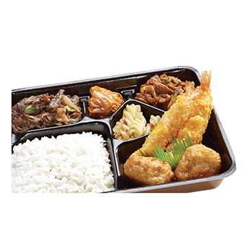 흰다리새우(중하)가 통으로 들어가 통통한 새우후라이, 부드러운 순닭다리살을 한솥이 개발한 튀김옷으로 바삭하게 튀긴 치킨가라아게, 부드러운 호주산 소목심에 한솥이 개발한 특제 불고기소스로 버무려 만든 소불고기, 살코기와 지방이 골고루 섞인 목전지를 사용하여 부드러우면서도 씹는 맛이 살아있는 제육볶음으로 구성된 푸짐한 도시락 입니다.