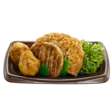 국내산 돼지고기의 등심 부분만을 두껍게 썰어 만든 돈까스, 진한 불고기 양념으로 만든 부드러운 고기산적에 쫄깃한 국내산 쌀떡이 들어있는 떡산적, 부드러운 닭다리살을 한솥이 개발한 튀김옷으로 바삭하게 튀긴 치킨가라아게로 구성된 베스트셀러 도시락의 반찬만 간편하게 드실 수 있는 먹음직한 실속반찬입니다.
