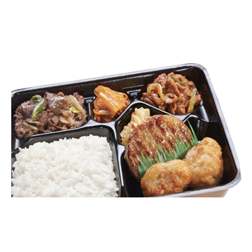 진한 불고기 양념에 재운 부드러운 햄버그에 쫄깃한 국내산 쌀떡이 들어있는 떡햄버그, 부드러운 순닭다리살을 한솥이 개발한 튀김옷으로 바삭하게 튀긴 치킨가라아게, 부드러운 호주산 소목심에 한솥이 개발한 특제 불고기소스로 버무려 만든 소불고기, 살코기와 지방이 골고루 섞인 목전지를 사용하여 부드러우면서도 씹는 맛이 살아있는 제육볶음으로 구성된 푸짐한 도시락 입니다.